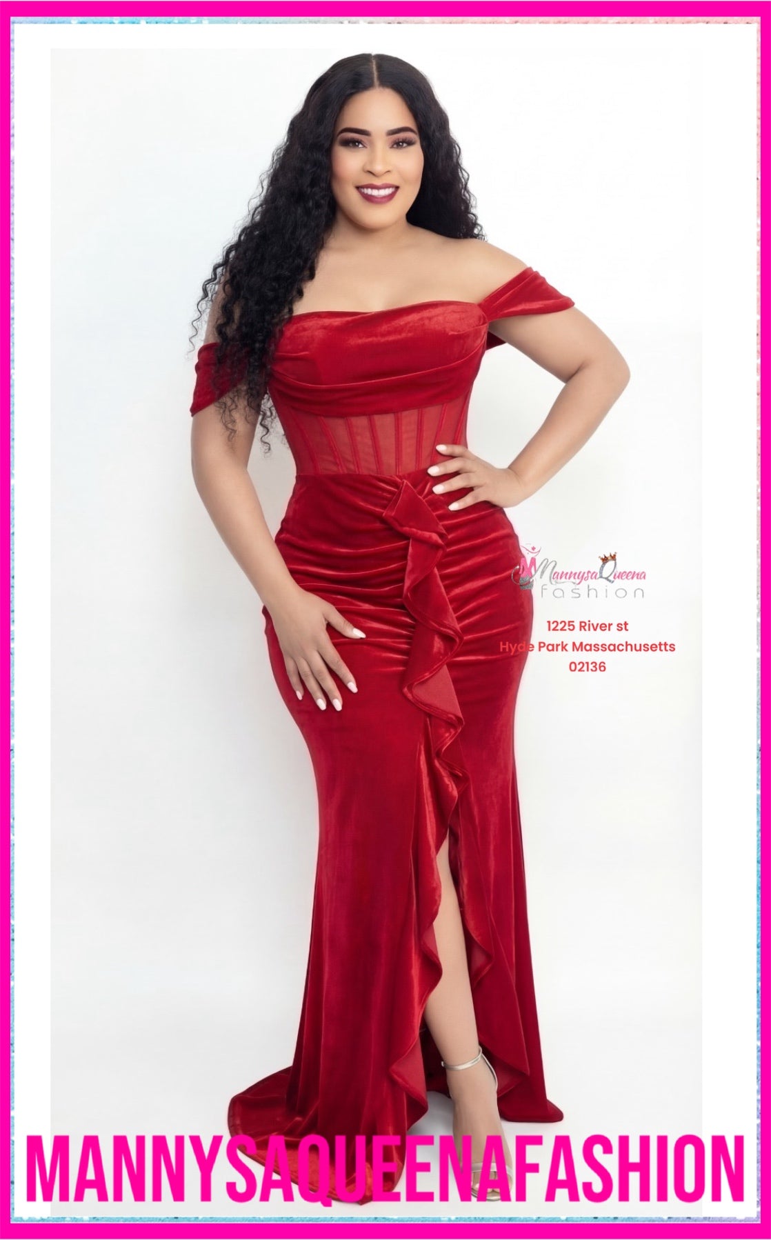 Solid color off the shoulder maxi velvet dress with a high low ruffle slit, cowl neck, back zipper, and mesh corset waist. Dress is fully lined except on mesh. Very stretchy.